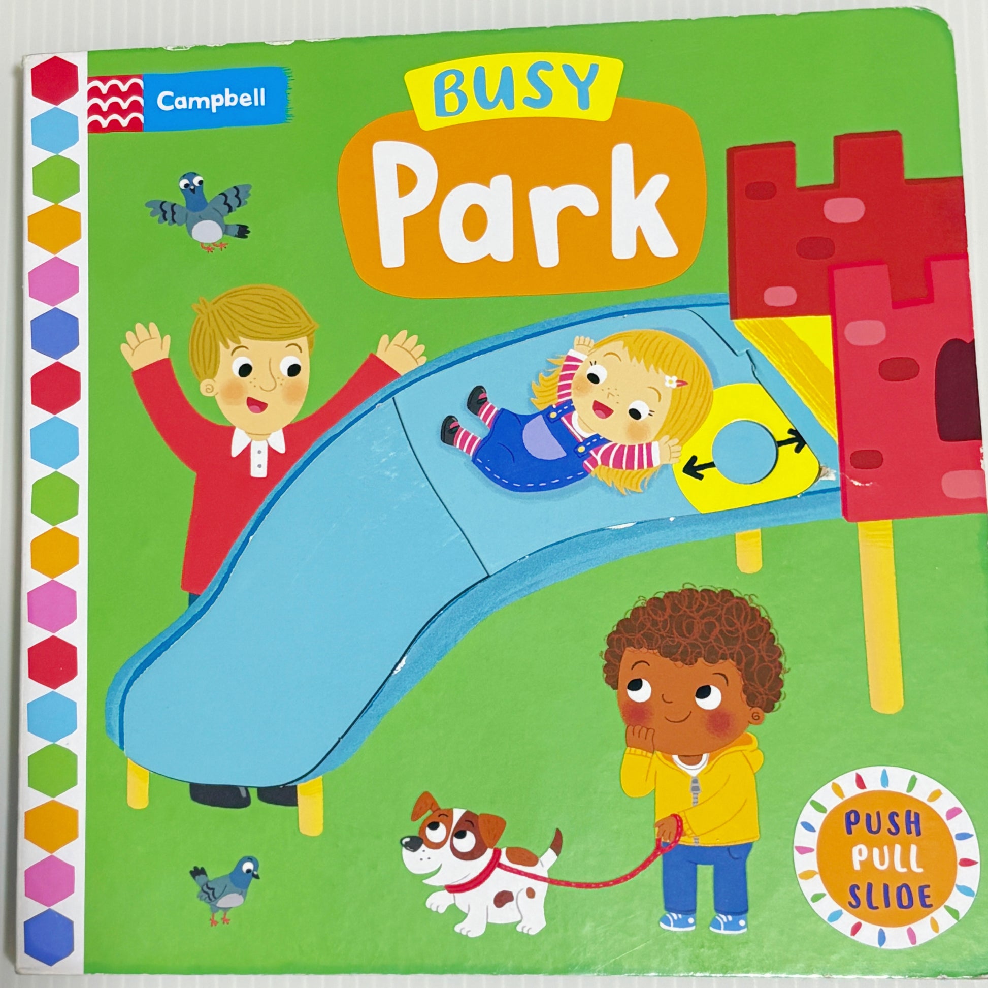 Push, pull and slide the tabs to enjoy a day out at the Busy Park! Visit the playground, spots lots of different animals and have a picnic.